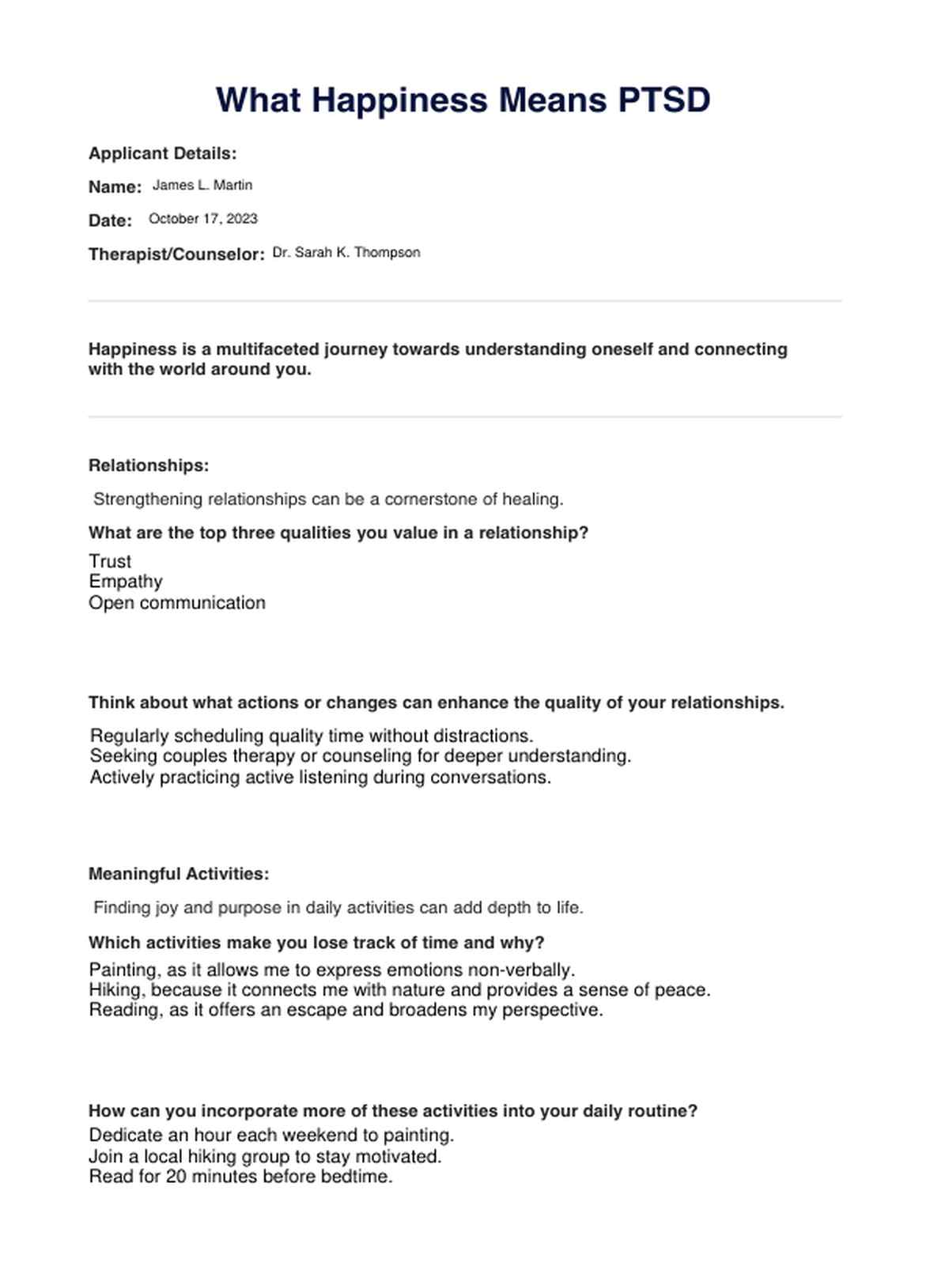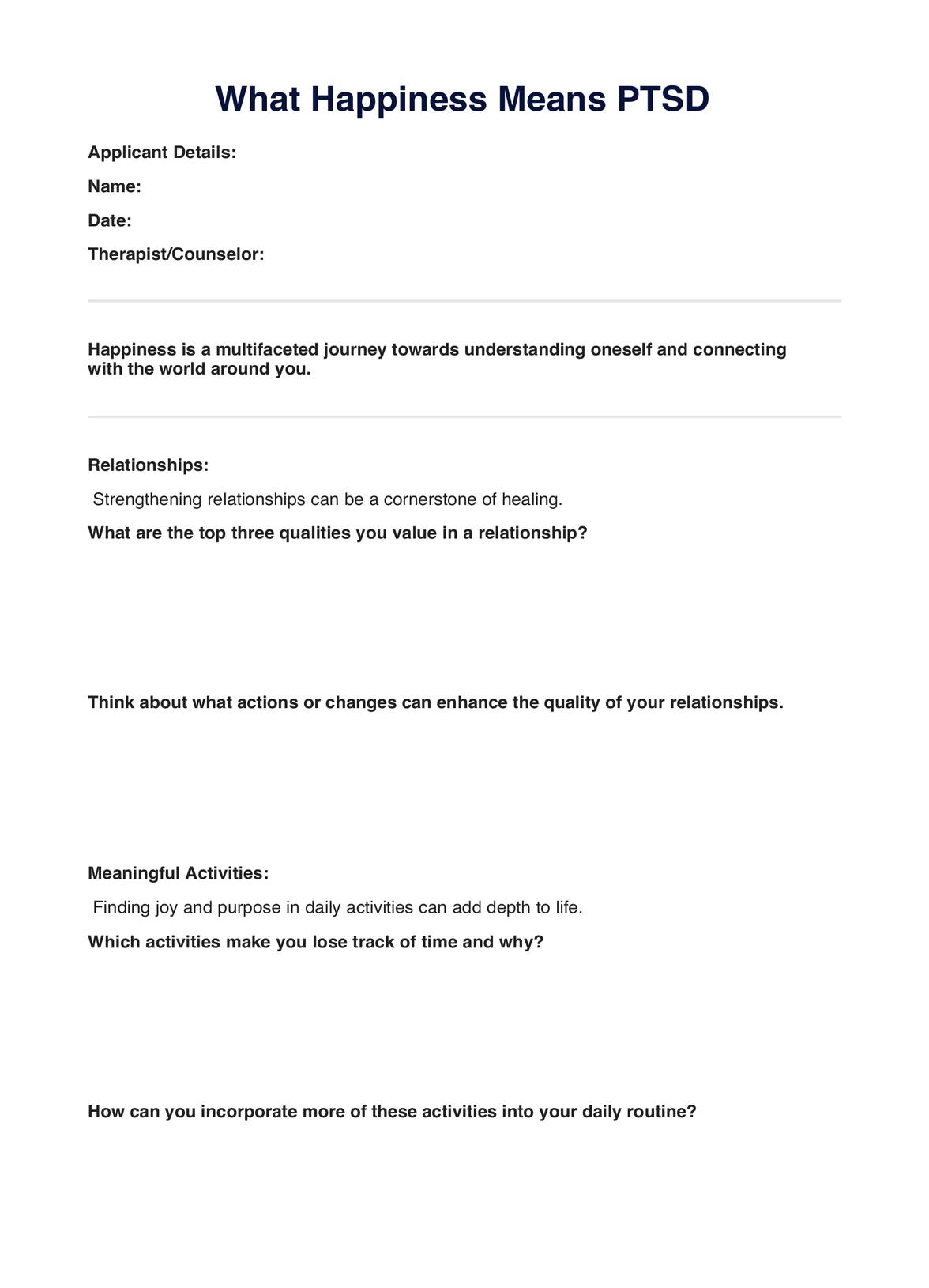 Descubra la hoja de trabajo sobre el TEPT "Qué significa la felicidad", una herramienta integral diseñada para ayudar a las personas a comprender y gestionar el TEPT al tiempo que exploran la felicidad personal.