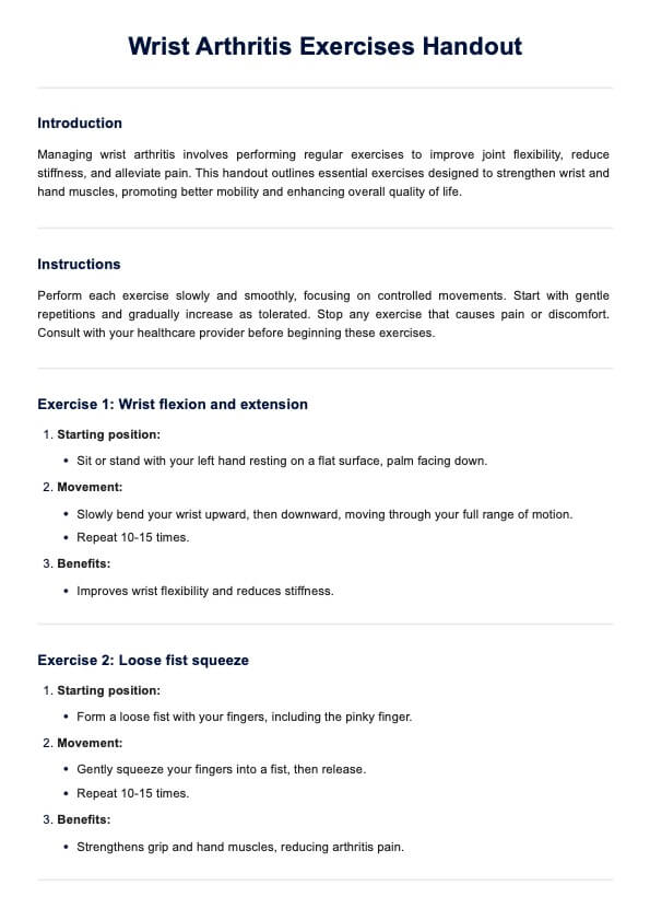 Mejore su artritis de muñeca con estos beneficiosos ejercicios. Descargue el folleto gratuito en PDF de Carepatron para obtener ejemplos y orientación sobre cómo realizarlos eficazmente.