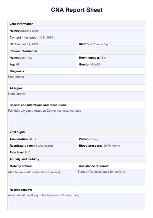 Ne sisältävät tyypillisesti potilaan demografiset tiedot, elintoiminnot, saannin/lähtömittaukset, määrätyt lääkitys- ja hoitotiedot sekä kaikki CNA: n tekemät muistiinpanot tai havainnot vuoronsa aikana.