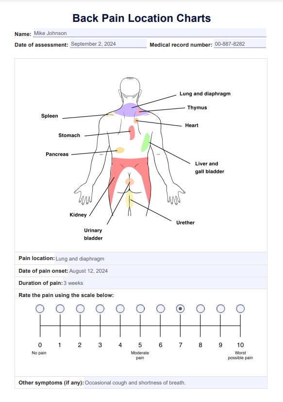 बैक पेन लोकेशन चार्ट के साथ बैक पेन असेसमेंट प्रक्रिया को ऑप्टिमाइज़ करें। बेहतर रोगी देखभाल के लिए अपने मूल्यांकन को सरल बनाने के लिए अभी डाउनलोड करें।