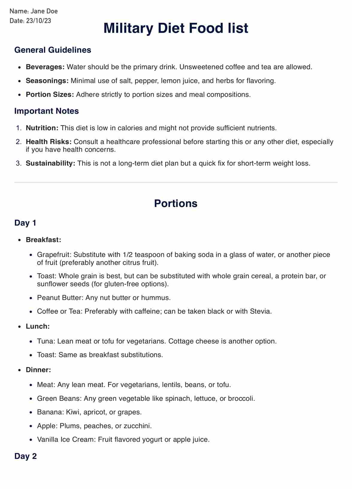 Jelajahi Daftar Makanan Diet Militer Carepatron: Panduan penurunan berat badan yang cepat dan efektif dengan rencana makan rendah kalori yang terstruktur.