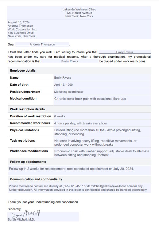 의료 전문가가 구체적인 제한 사항이나 편의 사항을 자세히 설명하는 근로 제한 서신을 작성한 다음 고용주에게 제출하여 직원의 직무 책임을 적절히 조정할 수 있도록 합니다.