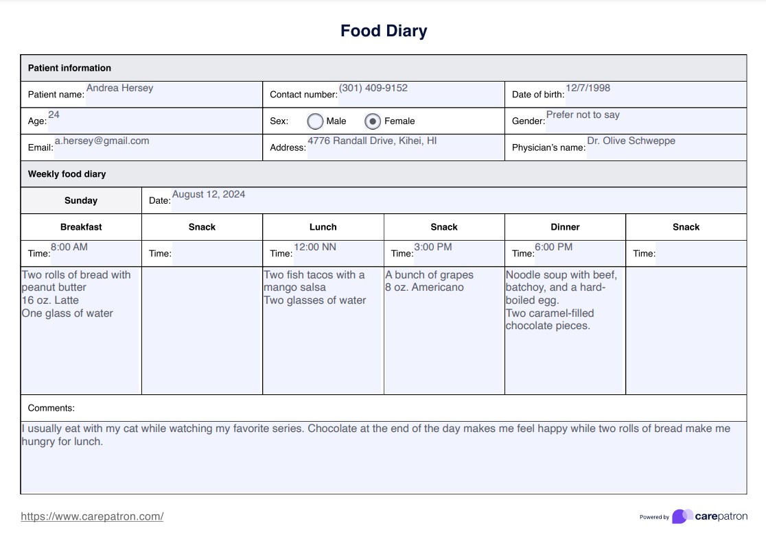 Templat Diari Makanan membantu anda menjejaki pengambilan makanan harian dan tabiat makan anda. Ia membolehkan anda merakam apa yang anda makan, berapa banyak yang anda makan, dan sebarang nota yang berkaitan, seperti alahan makanan atau intoleransi. Maklumat ini boleh digunakan untuk mengenal pasti corak dalam diet anda dan membuat perubahan yang diperlukan untuk gaya hidup yang lebih sihat.