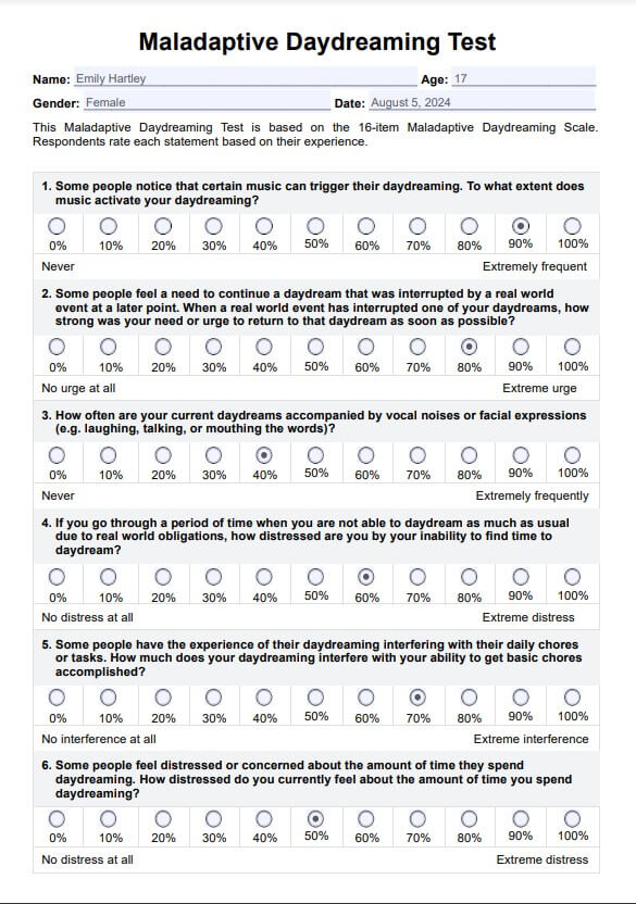 Mendiagnosis diri bermimpi yang maladaptif melibatkan merenungkan kekerapan dan intensiti episod bermimpi dan kesannya terhadap kehidupan seharian; namun, adalah lebih baik untuk berunding dengan profesional kesihatan mental. Templat ujian kami, yang mengandungi Skala Maladaptif Daydreaming 16 item (MDS-16), boleh digunakan sebagai penyarat sebelum menjadualkan perundingan kesihatan mental.