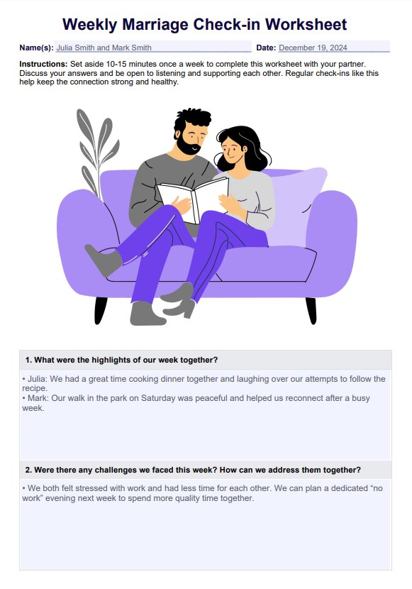 Help couples reflect on their relationships, identify successes, and address any challenges. Download this Weekly Marriage Check-in Worksheet for free.