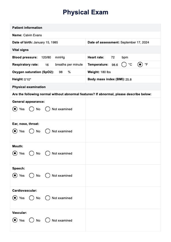 Verminder de administratieve lasten van fysieke examens met ons aanpasbare sjabloon voor lichamelijk onderzoek, geschikt voor zowel eenvoudige als uitgebreide examens, met een interactieve checklist en bonusruimte voor aanvullende informatie.