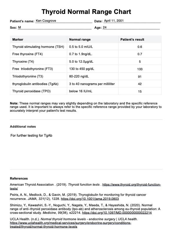 Det skyldes sannsynligvis forskjeller i populasjonene de har studert, spesielt plasseringen av disse populasjonene. Hvert laboratorium kan også ha forskjellige testmetoder, inkludert bruk av forskjellige enheter som miu/l eller mu/l for TSH-nivåer. Dette er grunnen til at vi gjorde malen vår redigerbar slik at du kan legge inn laboratoriets normale/optimale referanseområder.