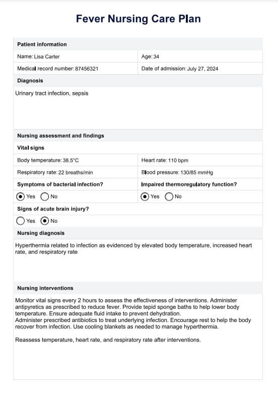 Bezpłatny plik PDF do pobrania Carepatron zawiera szablon do planowania opieki pielęgniarskiej. Pomaga zrozumieć diagnozy pielęgniarskie związane z gorączką i jak zapewnić odpowiednią opiekę pacjentom.