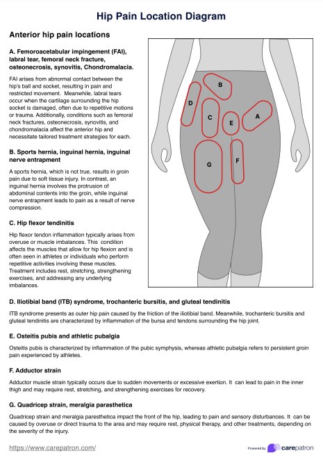 Os profissionais de saúde podem usar um diagrama de localização da dor no quadril como uma ferramenta de diagnóstico para identificar a área específica de desconforto ou dor que um paciente relata. Também pode ajudar a determinar a causa potencial da dor no quadril com base em sua localização na articulação do quadril e nas estruturas circundantes.