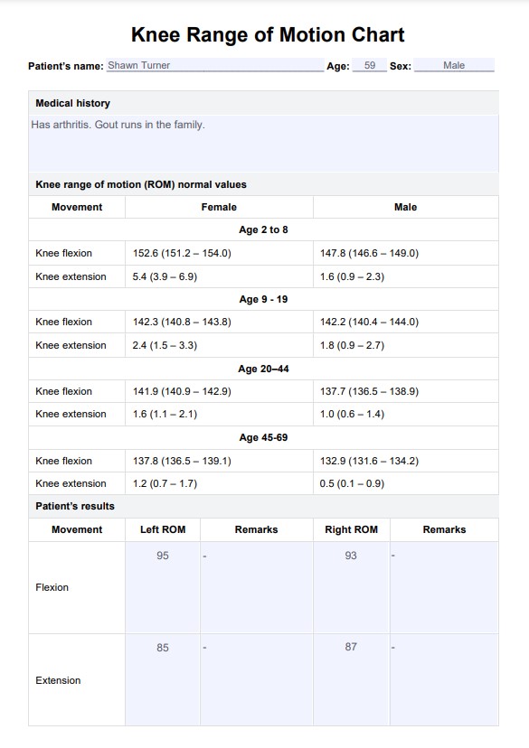 Utilize um gráfico de amplitude de movimento do joelho para avaliar a amplitude e as capacidades da articulação do joelho do paciente. Clique aqui para obter uma cópia gratuita do modelo!