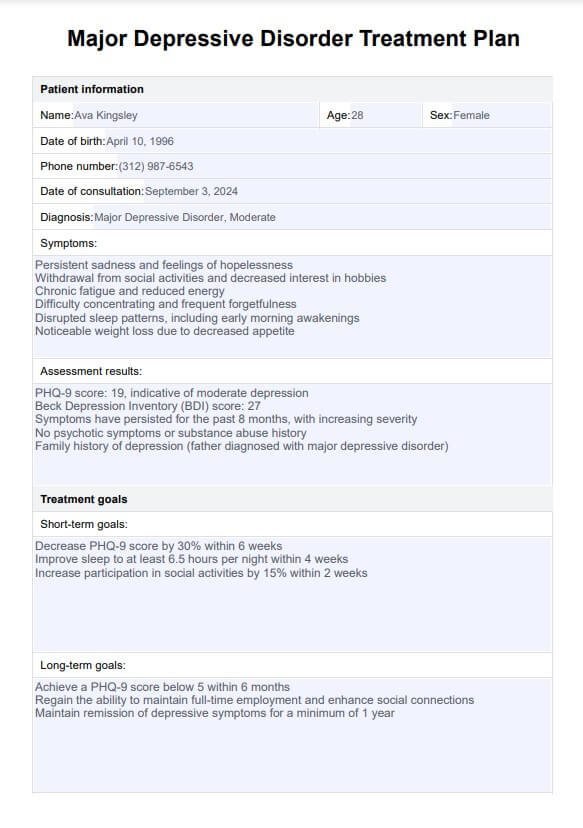 Tenha acesso a um plano gratuito de tratamento do transtorno depressivo maior e a um exemplo. Simplifique sua documentação clínica com nosso recurso de modelo gratuito.