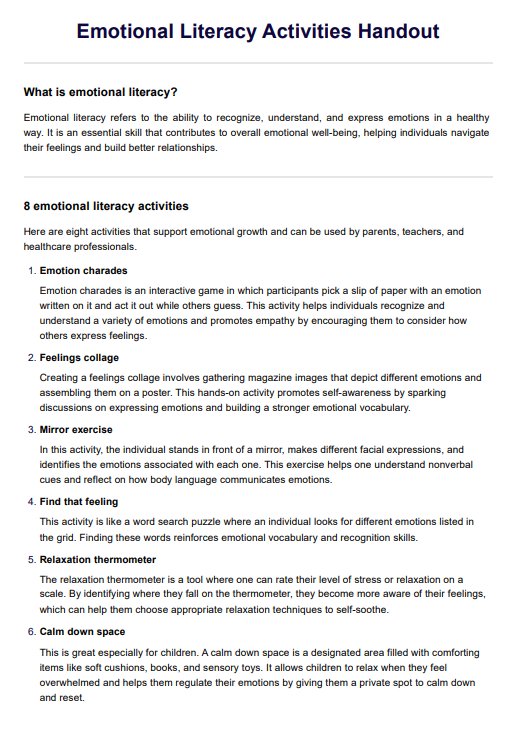 Explore engaging activities with our Emotional Literacy Activities Handout to help clients recognize, express, and understand emotions.