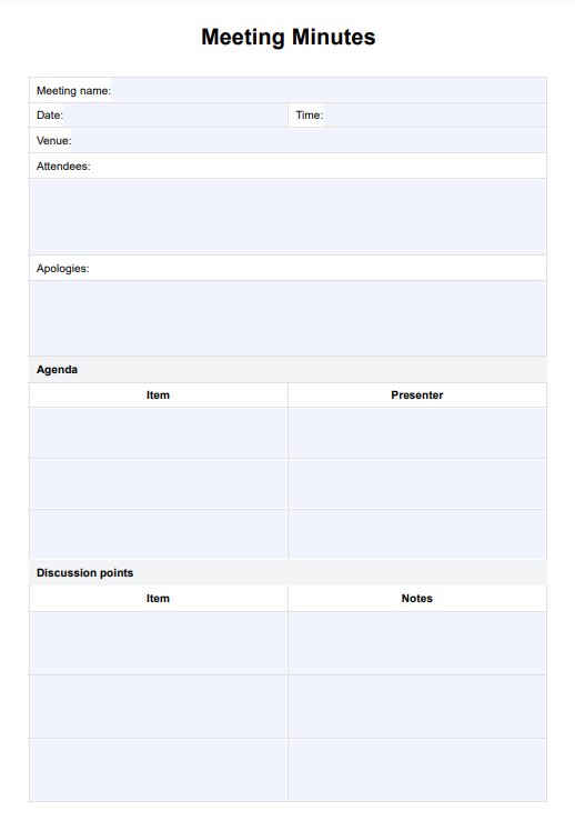 Få ut det mesta av dina möten med vår strukturerade mall för mötesprotokoll, som innehåller en mötesagenda och åtgärdspunkter.
