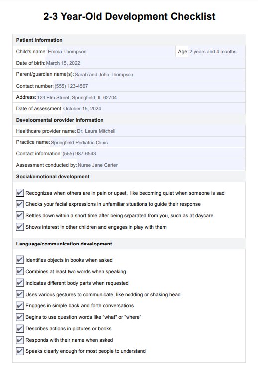 Track a child's development with Carepatron's free PDF download of the 2-3 Year-Old Development Checklist.