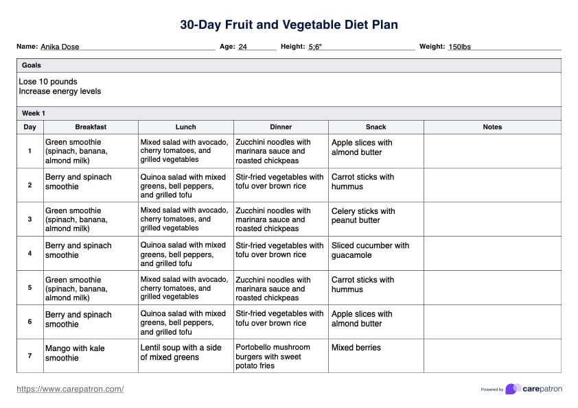 30-Day Fruit and Vegetable Diet Plan Template