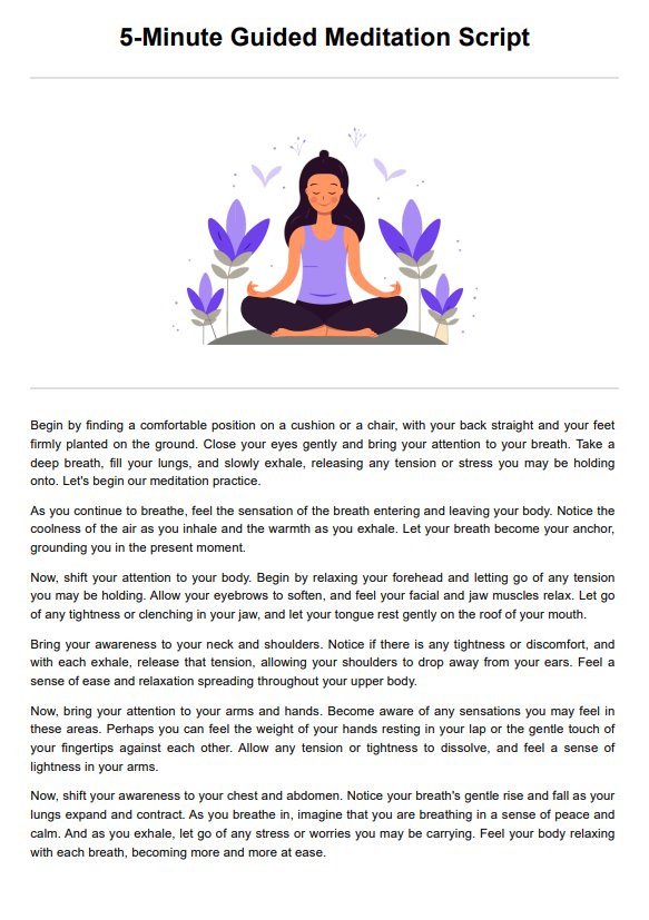 Guided meditations are audio recordings or live instructions that lead the listener through a meditation session. In these, a narrator or guide verbally walks the listener through relaxation techniques, visualizations, and mindfulness practices to help the listener meditate. This can incorporate the use of scripts in numerous ways.