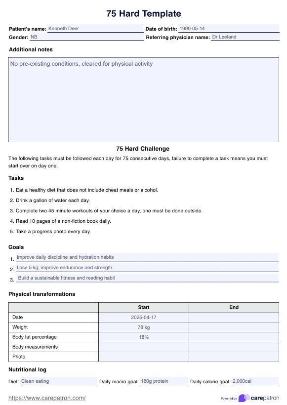 There are multiple apps and software that can help you create a 75 Hard Template. However, for convenience, you can create a document Carepatron or customize the one we provided in this guide.