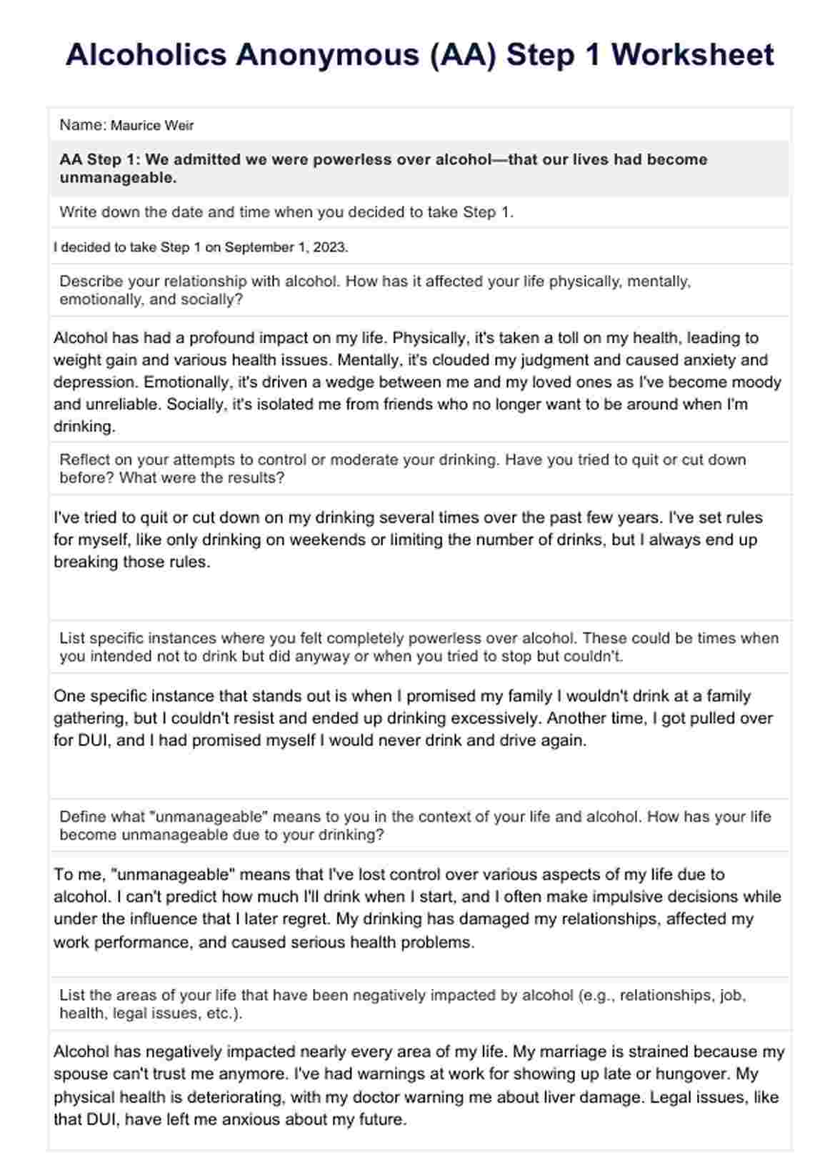 AA Step 1 Worksheets are used in the early stages of recovery, typically when a client has just started their Alcoholics Anonymous journey. The worksheet can be used to help clients assess their drinking patterns and identify potential areas of improvement.