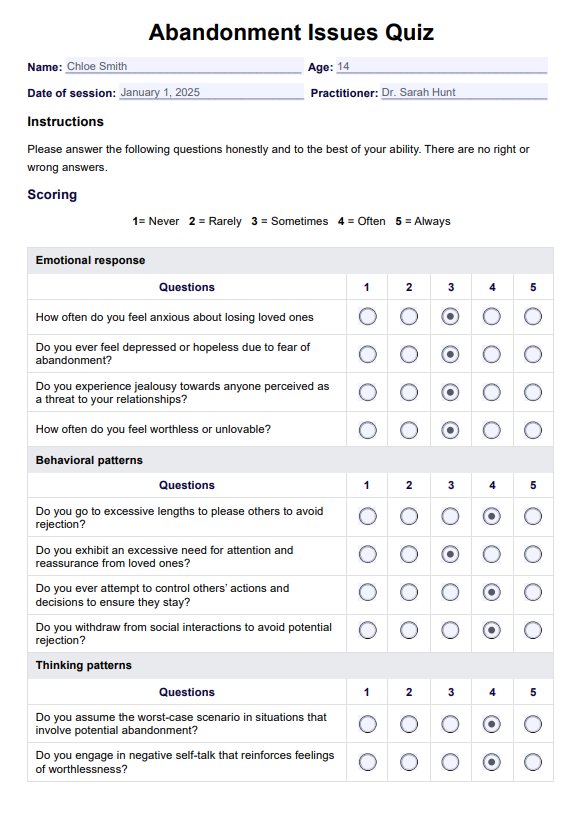 Support your clients by using this Abandonment Issues Quiz, a resource designed to provide valuable insights into your client's emotional well-being.