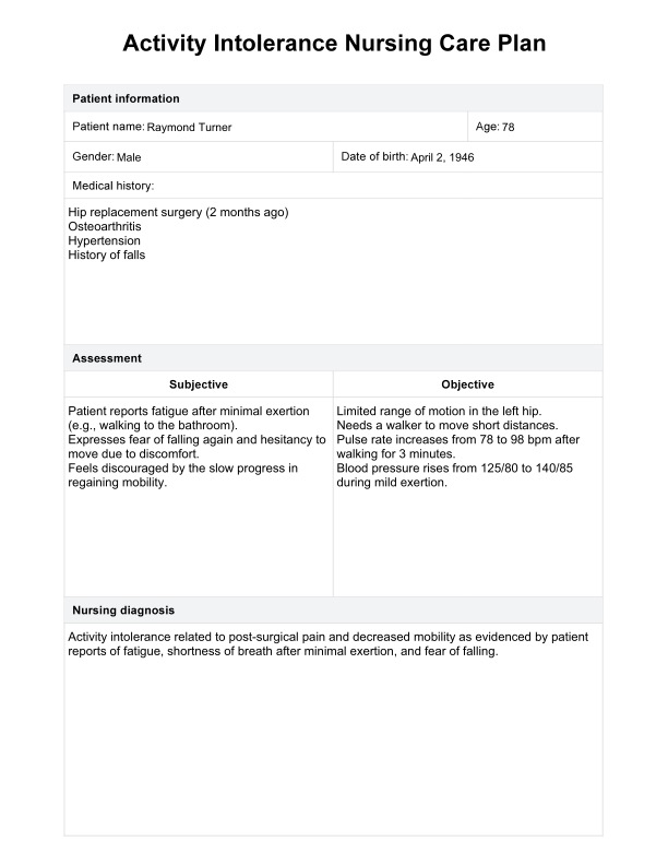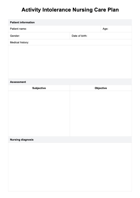 Use our Activity Intolerance Nursing Care Plan template in forming a plan to promote activity tolerance.