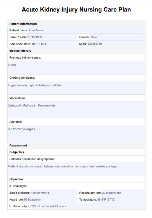 To create an Acute Kidney Injury Nursing Care Plan template, start by identifying key components such as assessment criteria, nursing diagnoses, and interventions tailored to managing AKI. Include sections for vital sign monitoring, lab results, and patient education to ensure a comprehensive approach to care.