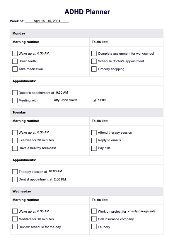 Help clients organize effectively with this ADHD Planner. Download Carepatron's free PDF example to better manage tasks and time, specially designed for individuals with ADHD.
