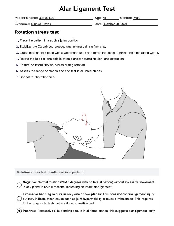 Our Alar Ligament Test template involves three clinical tests: the rotation stress test, side-bending stress test, and lateral shear test. These tests assess the ligament’s integrity by evaluating the movement at the upper cervical spine. For example, laxity in the left alar ligament may present as excessive motion when the head is rotated to the right.