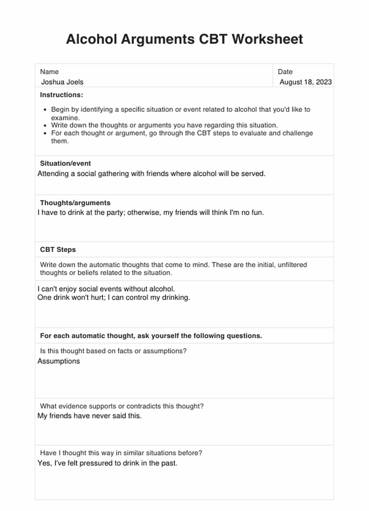 The Alcohol Arguments CBT Worksheet is designed to identify thought patterns and behaviors related to alcohol arguments to help clients develop healthier responses. It encourages self-reflection and personal growth, allowing clients to gain insight into these conflicts and how they affect their lives.
