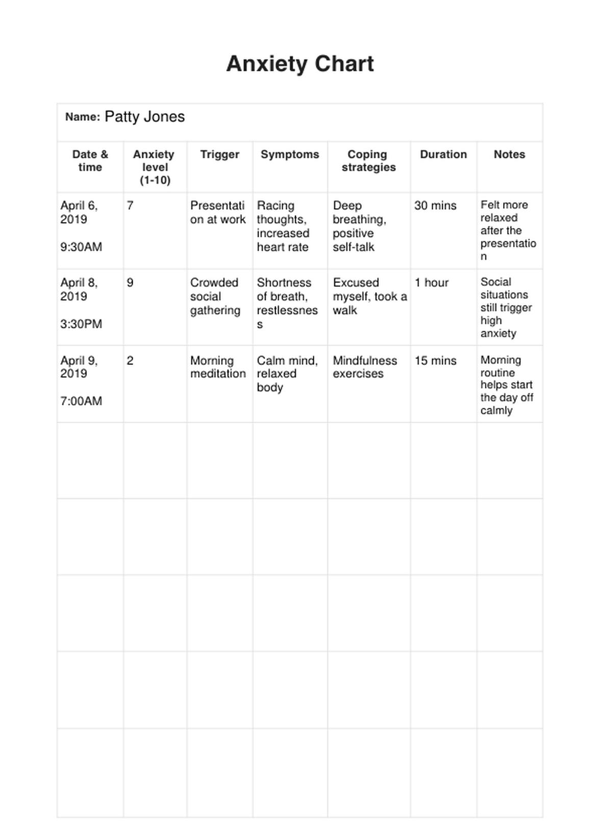 Anxiety Charts are used by clinicians, such as therapists and psychologists, to track a patient's progress while they work through their treatment plan. They provide an easy way for clinicians to keep track of the patient's symptoms and how they respond to different interventions over time.