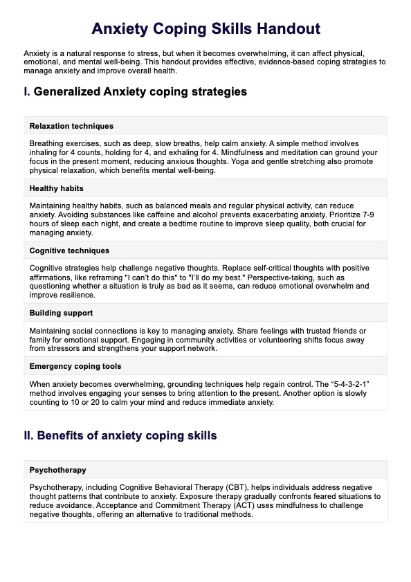 The best coping skills for anxiety include deep breathing exercises, mindfulness meditation, and physical activities like exercise or yoga. These techniques help manage stress, calm the mind, and reduce the physical symptoms of anxiety.