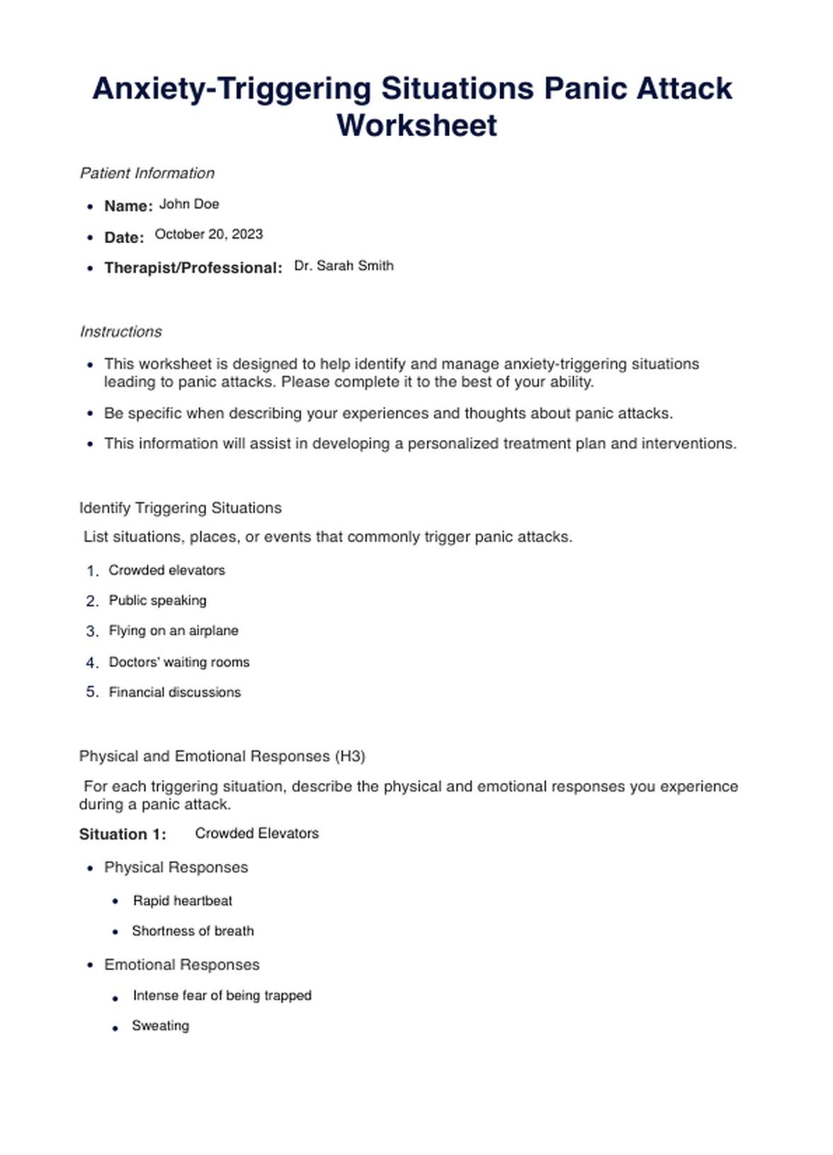 This worksheet helps individuals identify panic triggers, develop coping strategies, and provides insights for therapists to tailor treatment plans.