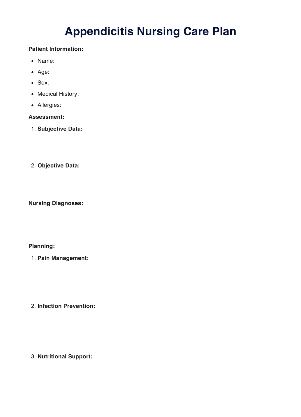 To create an Appendicitis nursing care plan template, begin with a thorough patient assessment. Identify nursing diagnoses, set measurable goals, devise evidence-based interventions, and regularly evaluate and adapt the plan based on the patient's response. Utilize Carepatron's user-friendly platform for efficient and standardized template creation.