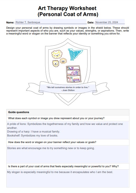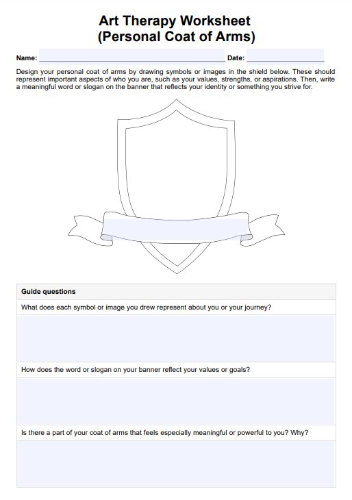 Give your client a Personal Coat of Arms Art Therapy Worksheet so they can create symbols that represent themselves and/or their families.
