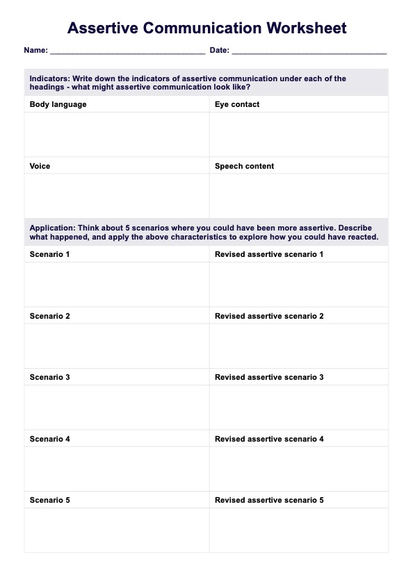 Assertive communication worksheets include questions and exercises for the client to work through. In other words, you do not have to think extensively about the content that you're writing, as the worksheets include relevant prompts for you to answer. Simply complete the questions, spending a fair amount of time on each one, to ensure you’re extracting the most value out of the worksheets.