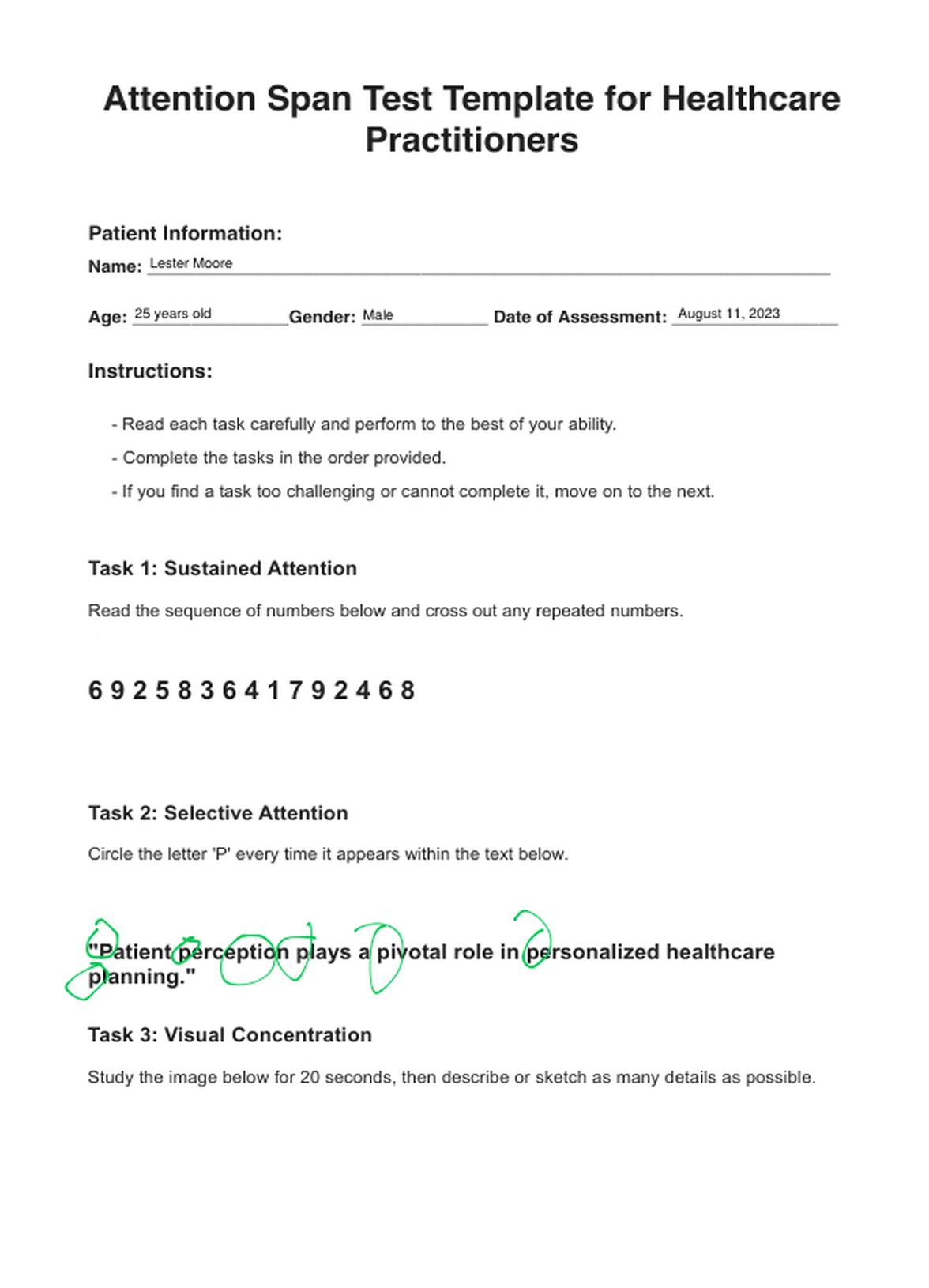 Attention Span Tests typically involve a series of tasks that require the individual's active participation. These tasks can be presented visually, auditorily, or through a combination. The individual's performance is then evaluated based on accuracy and ability to sustain attention during the tasks.