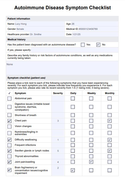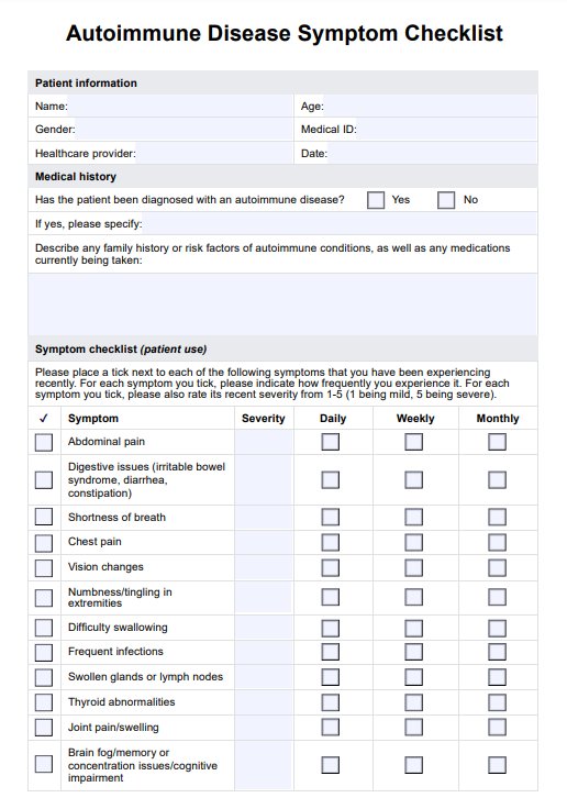 Access Carepatron's free Autoimmune Disease Symptom Checklist, a comprehensive resource for identifying symptoms of autoimmune diseases.