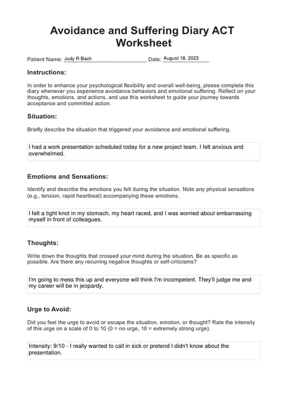 Improve healthcare with Avoidance and Suffering Diary ACT Worksheet. Transform habits for better well-being. Download now!