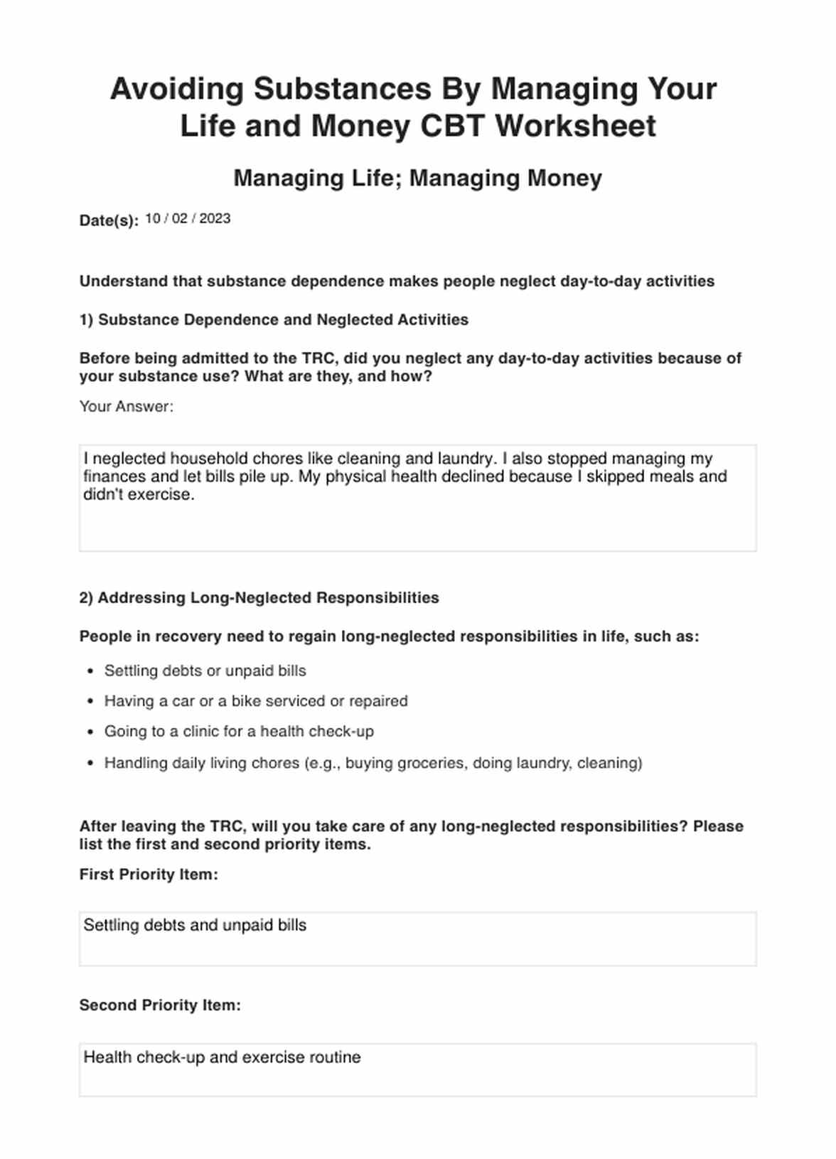 Avoiding Substances By Managing Your Life and Money CBT Worksheet Template