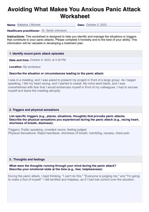 This worksheet aims to help individuals and healthcare practitioners gain insights into the causes and triggers of panic attacks. It aids in developing strategies for managing panic attacks effectively.