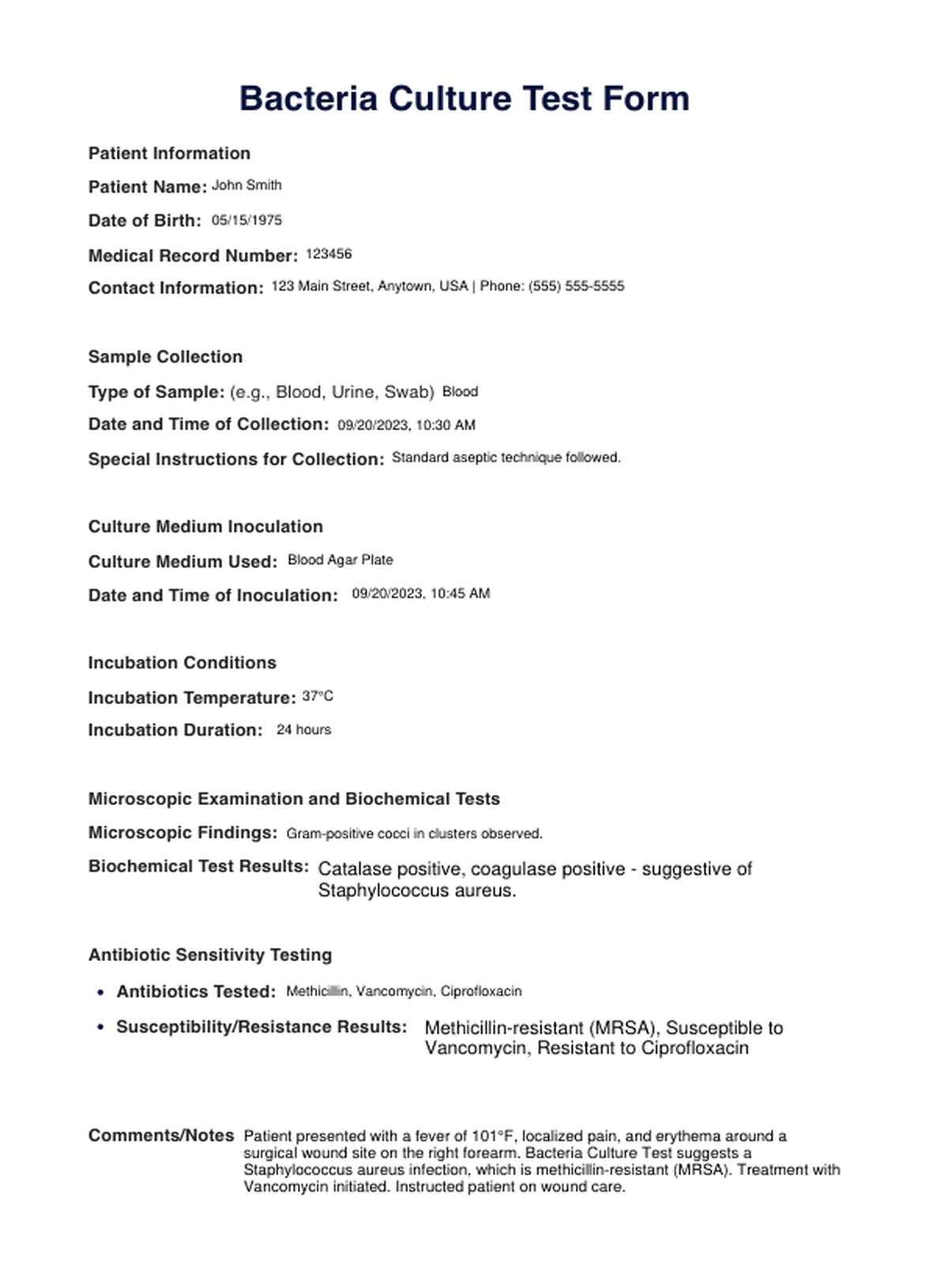 Bacteria Culture Tests are used when there is a clinical suspicion of a bacterial infection. Typical scenarios include fever of unknown origin, urinary tract infections, wound infections, respiratory infections, and suspected sepsis.