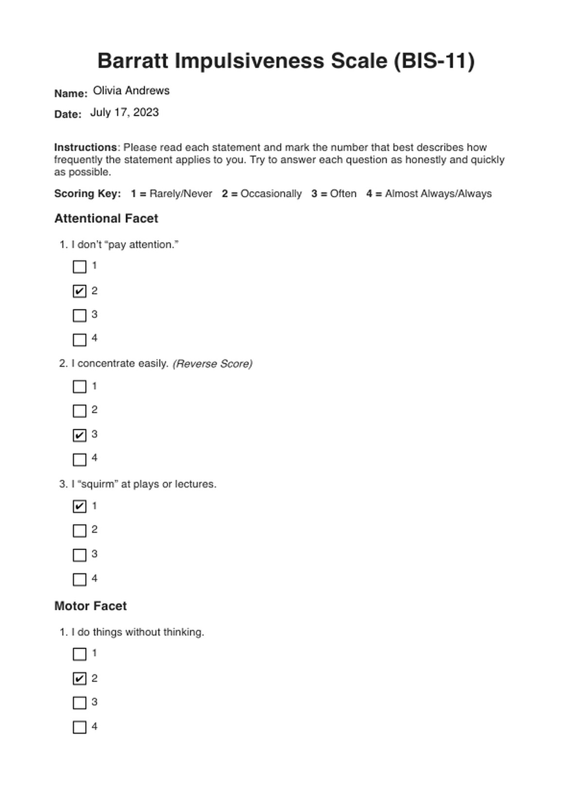 Discover how the Barratt Impulsiveness Scale (BIS-11) can help evaluate impulsivity in your practice. Carepatron offers it for efficient patient management.