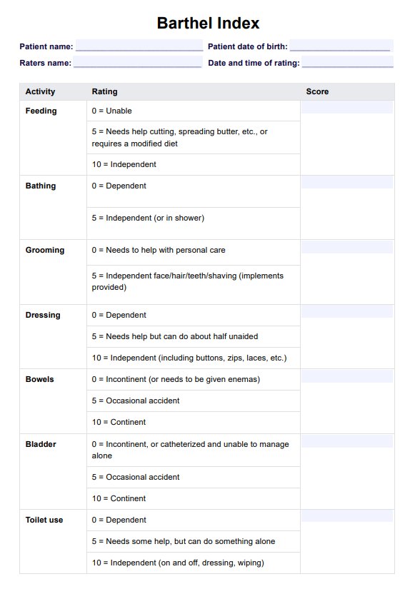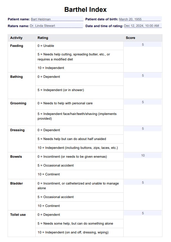 The Barthel Index is widely used to assess functional independence in activities of daily living (ADLs) across a variety of clinical settings and patient populations, including stroke patients, patients with musculoskeletal disorders, brain injuries, mental disorders, and multiple sclerosis. This can also be helpful in hospital discharge planning and nursing home care.