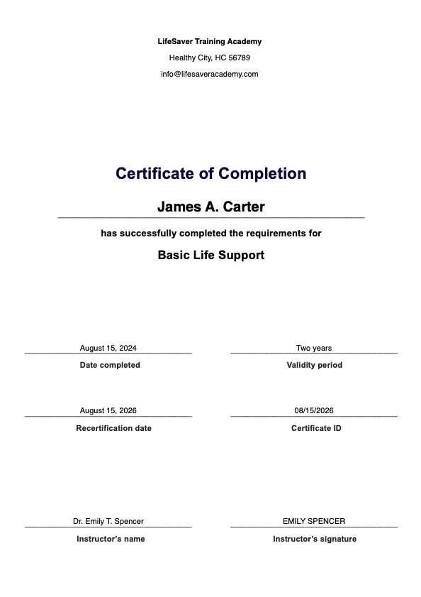 Download a Basic Life Support Certificate template for certifying skills in CPR, AED use, and life-saving techniques. Get this for free today!