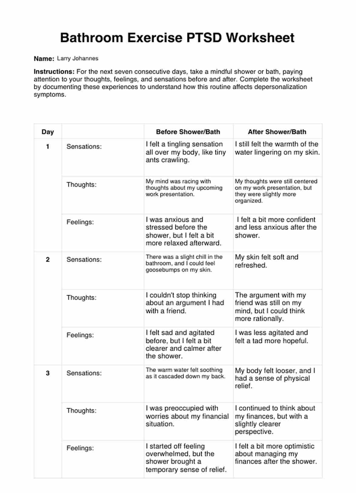 Ease PTSD and depersonalization symptoms with the Bathroom Exercise PTSD Worksheet. Enhance self-awareness and well-being by downloading your copy today.