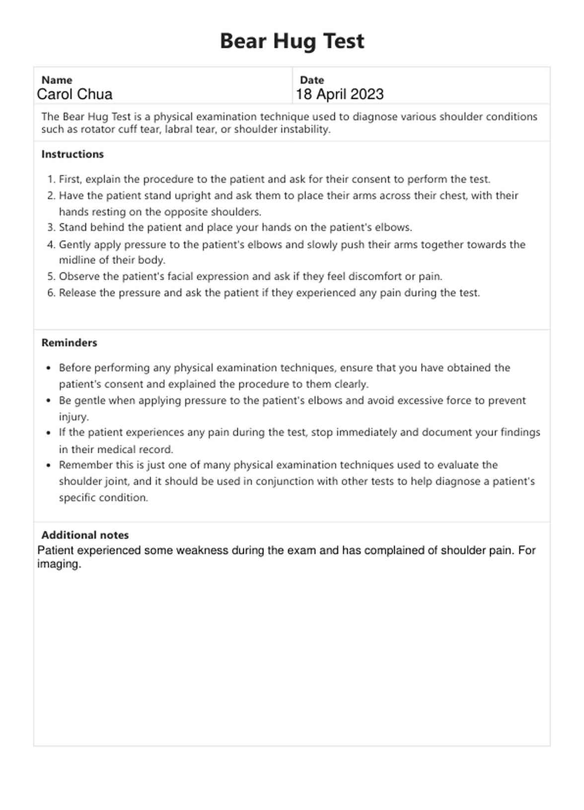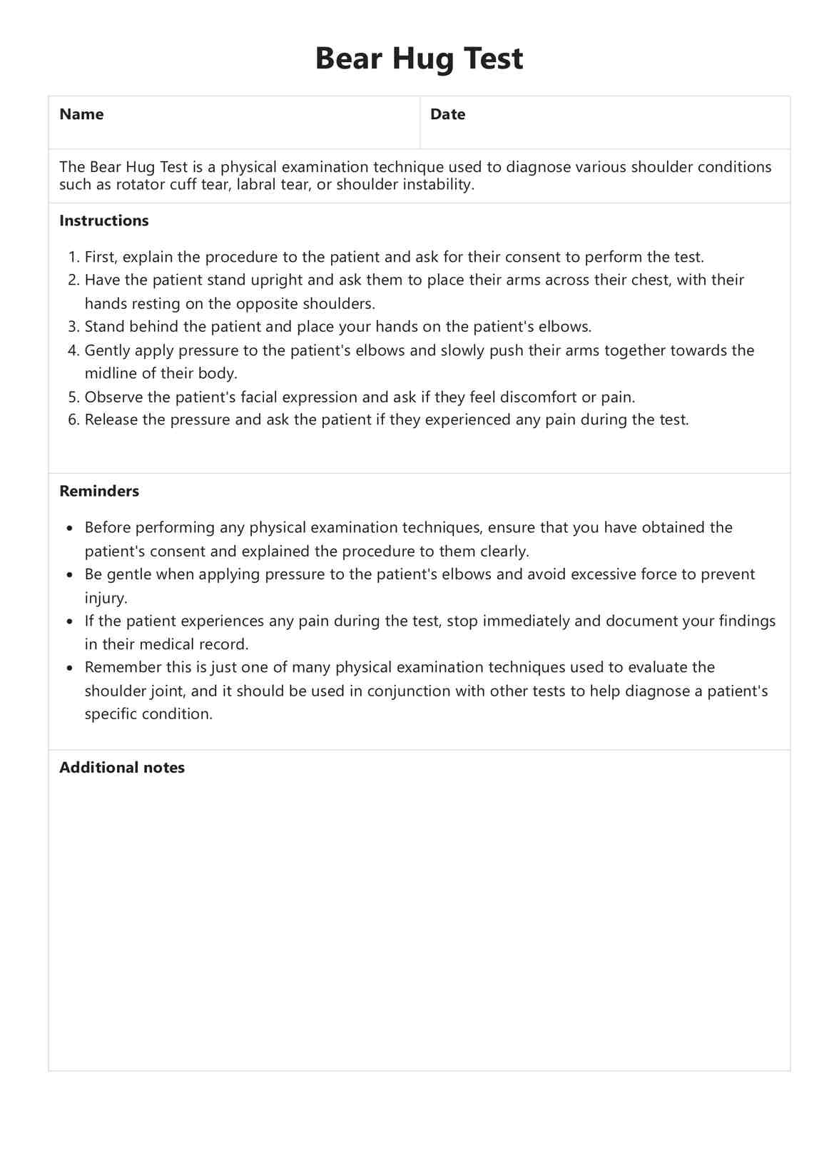 Bear Hug Test Template