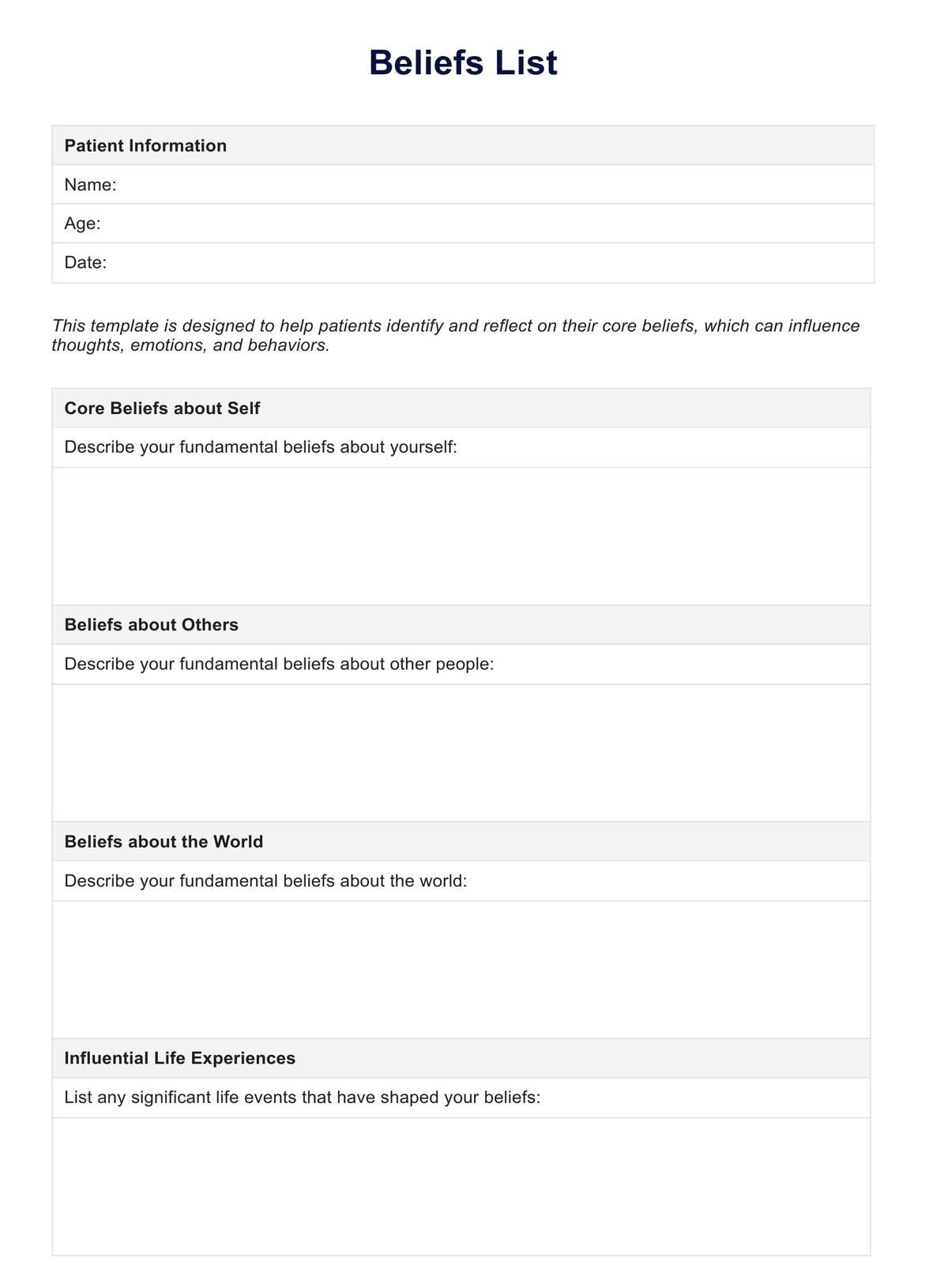 Explore our comprehensive guide on Core Beliefs, featuring a Beliefs List Template, examples, and strategies for personal growth and mental wellness.