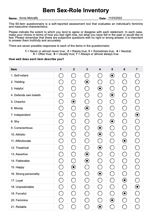 Click here to learn more about the Bem Sex-Role Inventory and how to use it. Download a free PDF template from Carepatron.