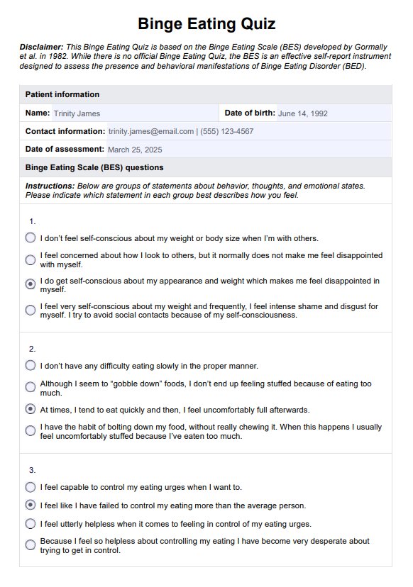 Use Carepatron's free Binge Eating Quiz PDF download to assess patient habits and easily identify, understand, and manage binge eating behaviors.