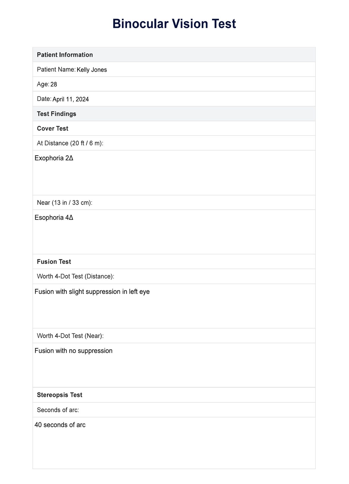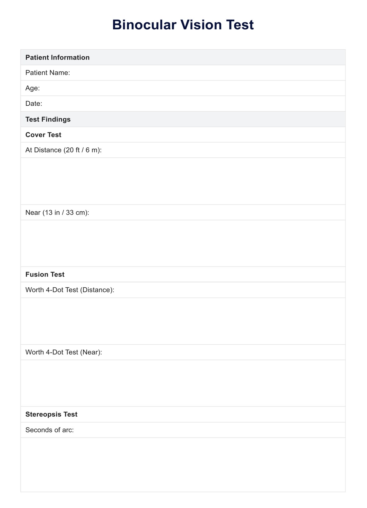 Carepatron's free PDF download provides a binocular vision test example that you can use to assess your vision. Learn more about binocular vision and how to conduct the test effectively.