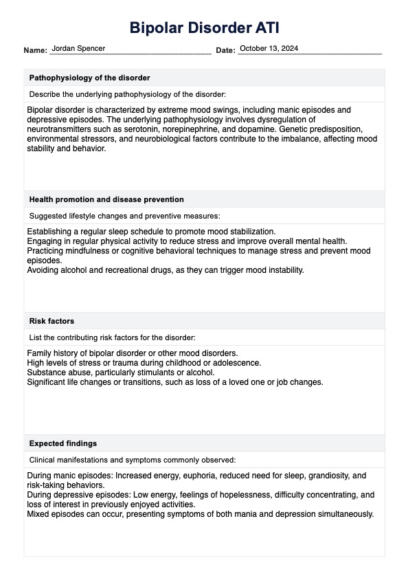 The Bipolar Disorder ATI template is a comprehensive educational tool that facilitates the understanding and management of bipolar disorder. It guides educators and learners through a structured exploration of the condition. This template helps gather, organize, and analyze patient information, including symptoms and treatment responses while promoting critical thinking and collaborative discussions.